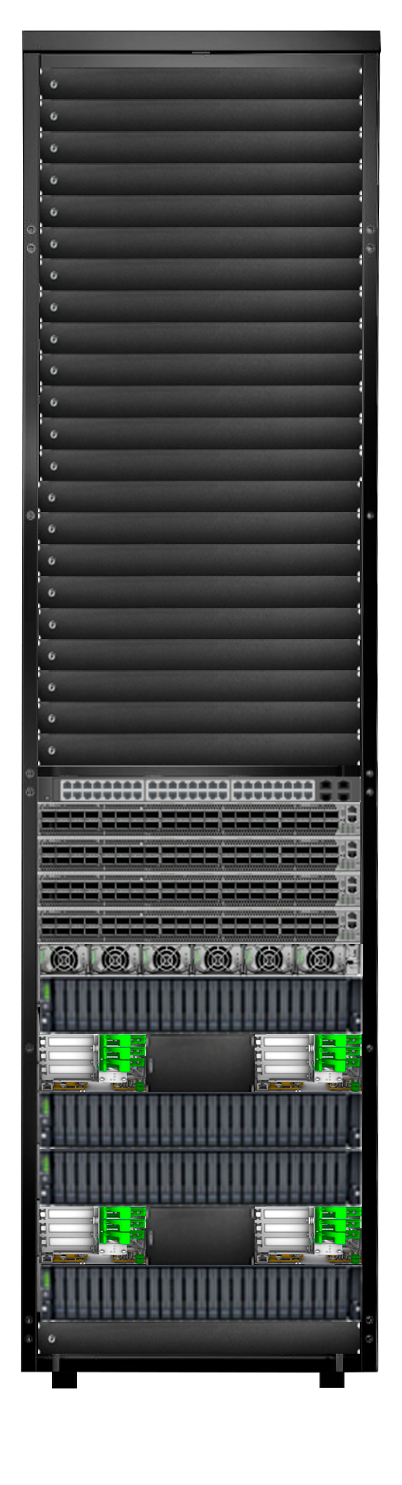 Пример типовой конфигурации комплекса для хранения данных на базе ПО Аэродиск и оборудования GAGAR>N строится на базе 2 систем хранения, в каждой по 2 сервера-контроллера и по 2 дисковых полки с 24-мя накопителями 1,92TB SSD SAS.